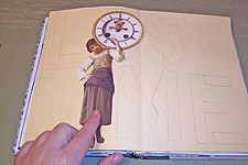Hey, she looks pretty good on this background! I went ahead and glued her down, positioning carefully to cover the proper letters, and keep the clock balanced on her shoulder.