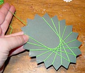 OK, this is the really easy part: just wrap your threads back and forth, from one side of the template to the other. I moved clockwise, and wrapped through every notch. Here, you can see what the spirella looks like after wrapping through four notches